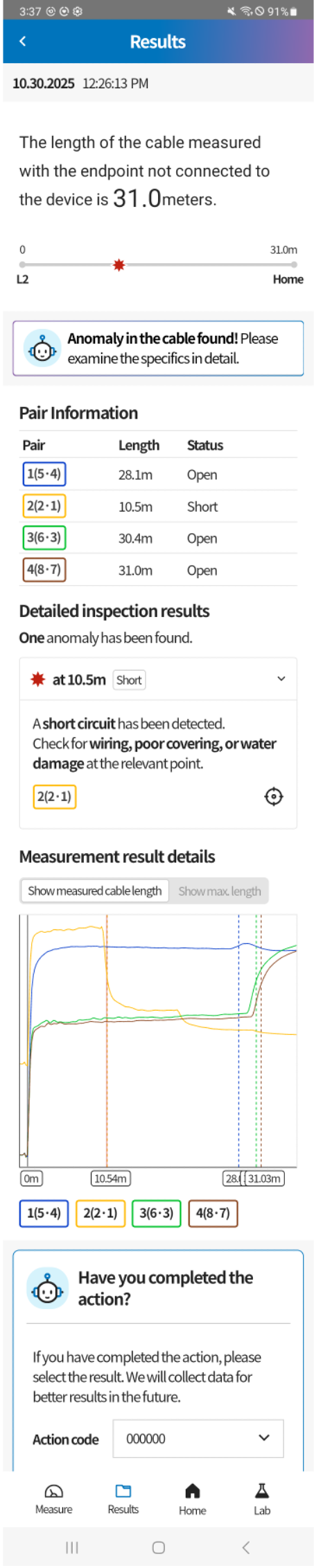 On the measurement results page, you can pinpoint failure cable sections based on TDR measurement data analyzed by AI. Each item provides the following information: